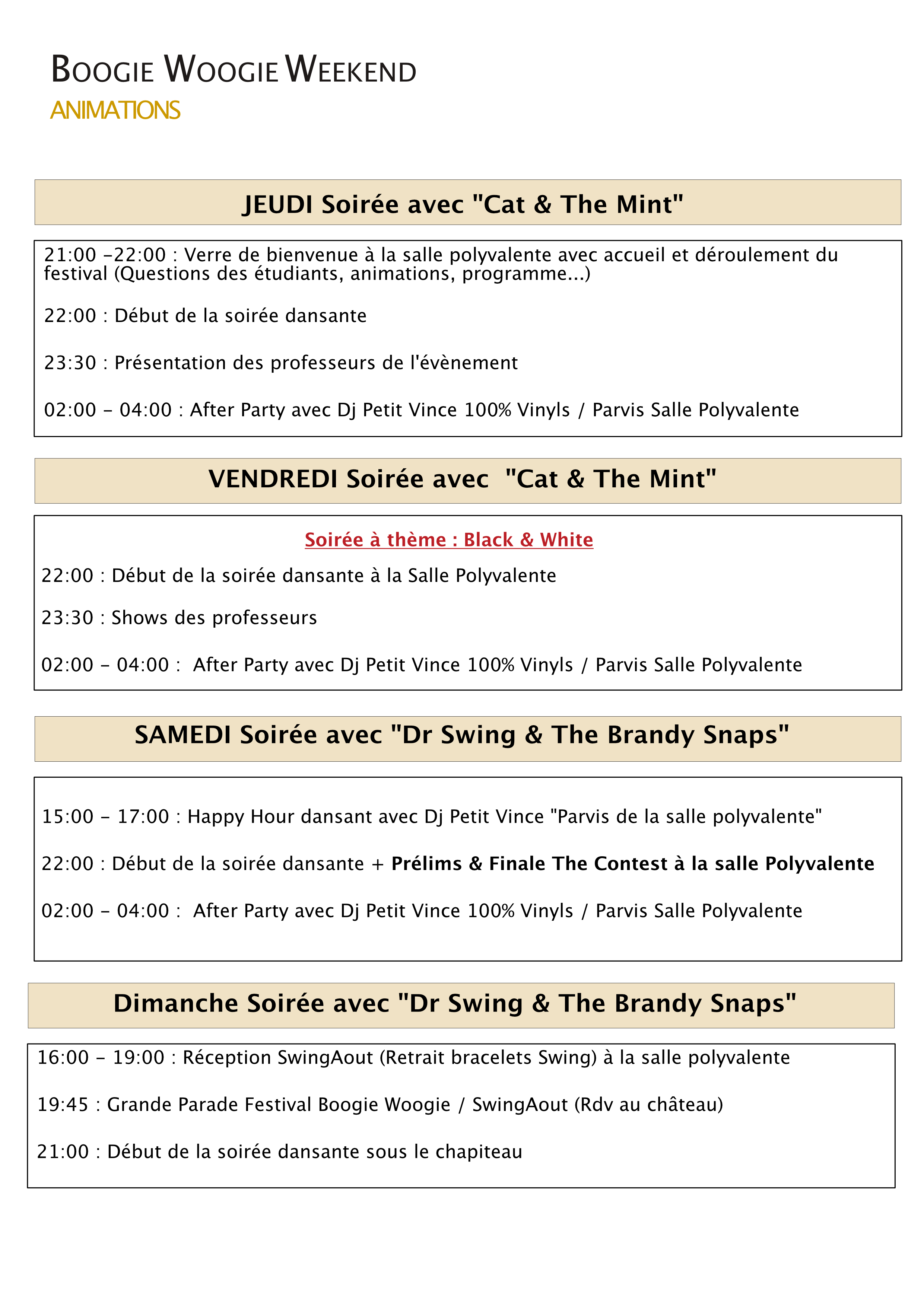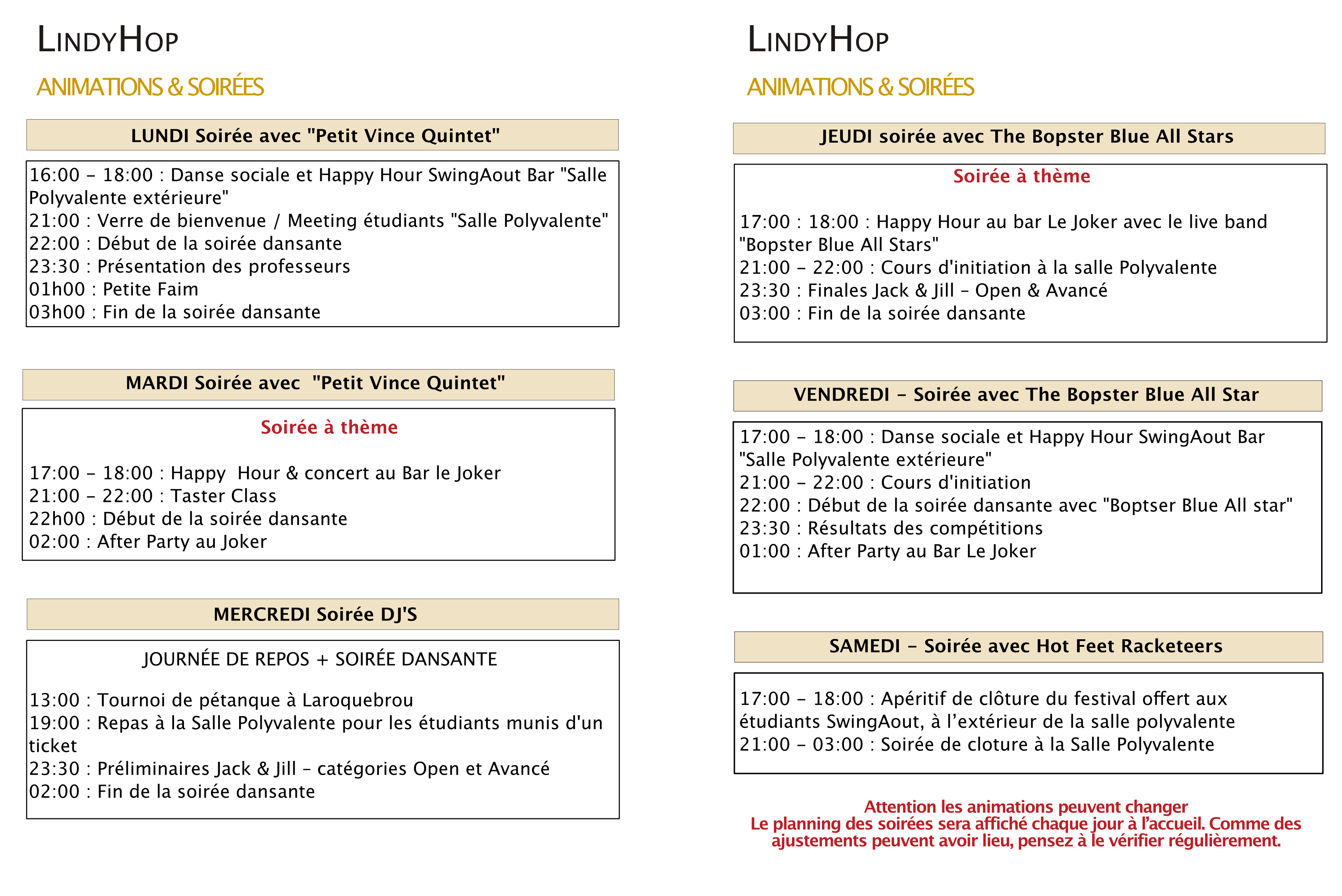 SwingAout Festival propose des soirées dansantes à l’ambiance unique avec de la musique live tous les soirs dans la salle Polyvalente et des afters aux rythmes Swing et Funk au bar Le Joker. Venez profiter de cette atmosphère magique et découvrir le programme que nous vous avons réservé pour cette nouvelle édition.